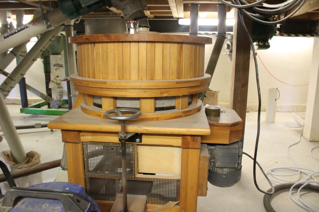 Grace à la meule de pierre les grains de blé ou de céréales vont être broyés , cela peut se faire sur plusieurs passages selon le grains.