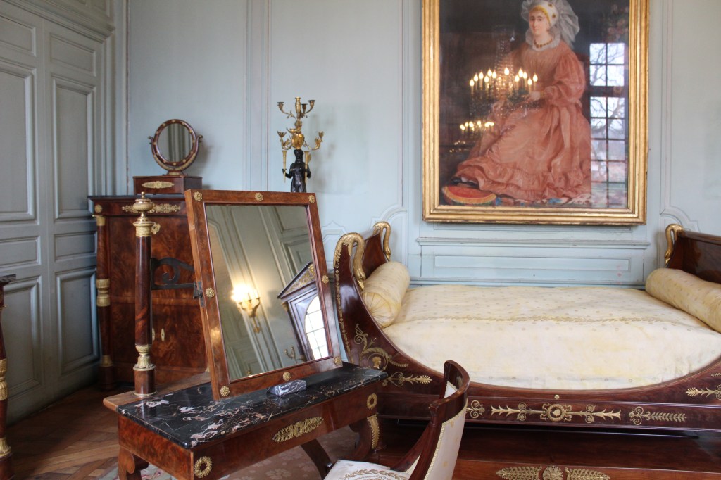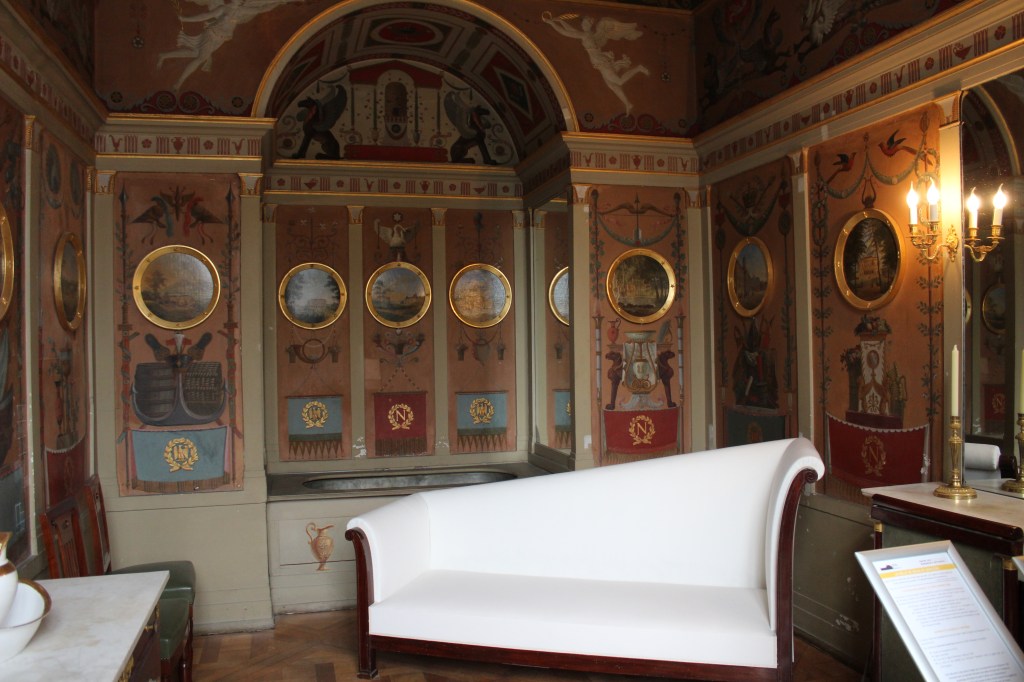 L’une des pièces que j’ai le plus apprécié est la salle de bain de Napoléon Ier. Cette salle de bain, conçue en 1807, a conservé son décor peint d’origine. Inspiré du style pompéien, il évoque l’Empire avec des représentations de trophées et de batailles navales. Les quatorze médaillons peints montrent des vues d’Italie et des résidences impériales. Sur le mur du fond, au-dessus de la baignoire en zinc, une ruche encadrée de griffons évoque l’emblème impérial, l’abeille. La salle représente également, par ses 16 décors, les portraits de la famille Impériale.