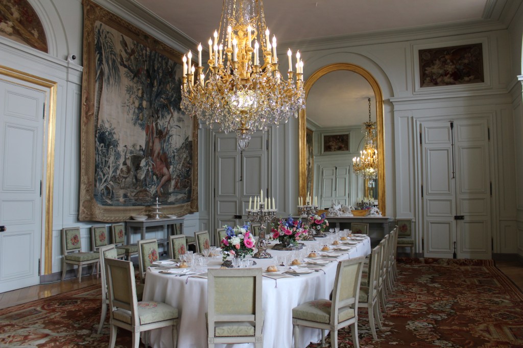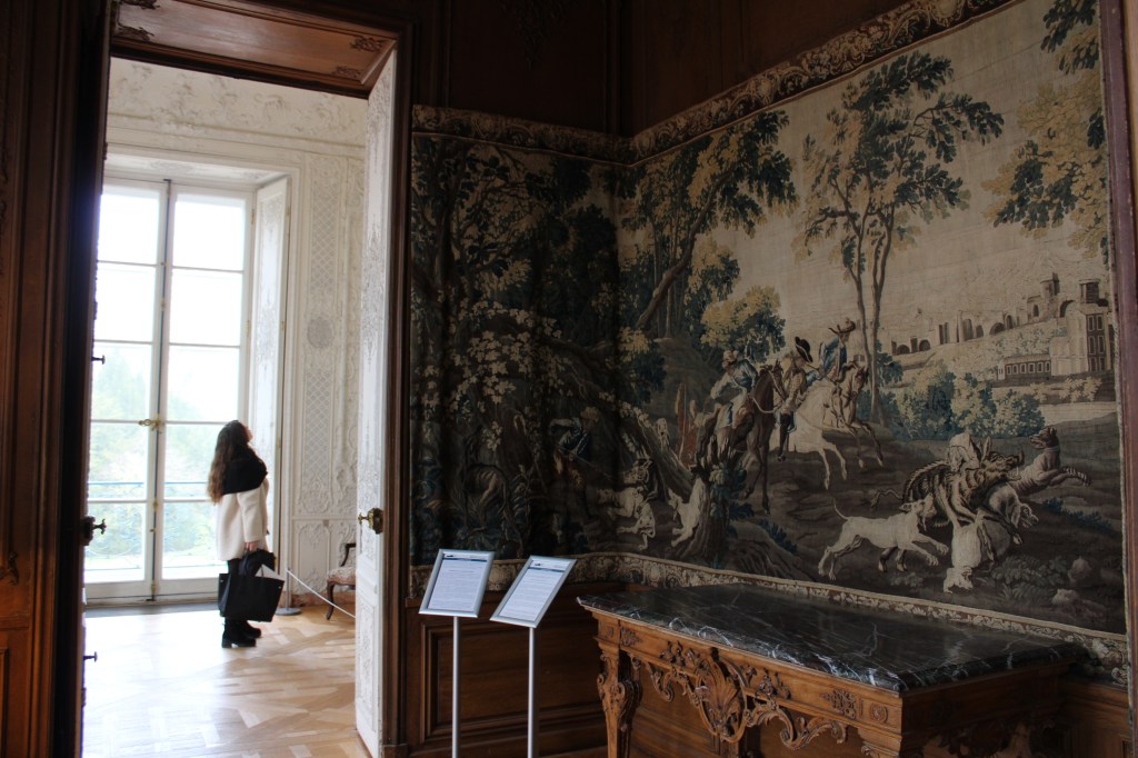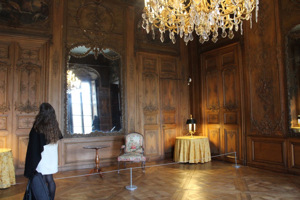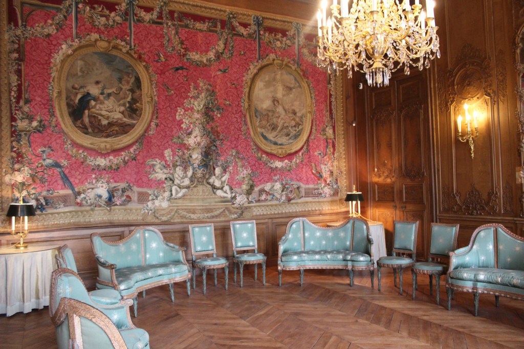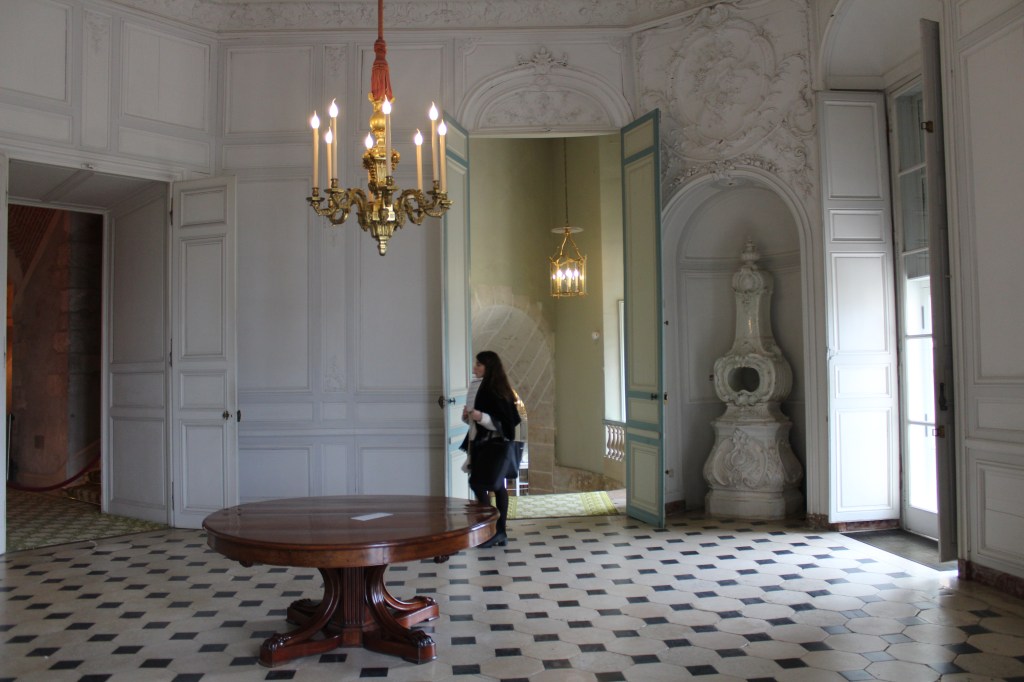 Une fois le portail de l’entrée et la cour d’honneur passés, nous arrivons dans le hall du château. La visite commence par trois pièces en enfilade. Tout d’abord les appartements de l’Empereur avec la salle à manger et la chambre. L’empereur Napoléon 1er y séjourna pour sa dernière nuit en France avant d’être exilé sur l’ Ile d’Elbe. Ensuite nous sommes passées par le boudoir dit de Marie -Antoinette puis par l’antichambre et sa bibliothèque. Le grand salon est composé de superbes boiseries du XVIII ème siècle. Je remarque qu’a chaque coin de la pièce, un animal est représenté pour indiquer les continents ( Asie, Afrique, Europe et Amérique) entre chaque animal, les 12 signes du zodiaque sont également représentés.