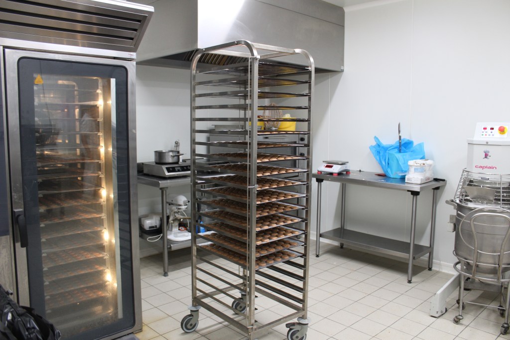 A l’entrée, nous découvrons le stock de matières premières, les matières sèches ainsi que le matériel professionnel utilisé pour la fabrication des macarons.Madame Froger nous explique que 4 boxes constituent le coté fabrication.