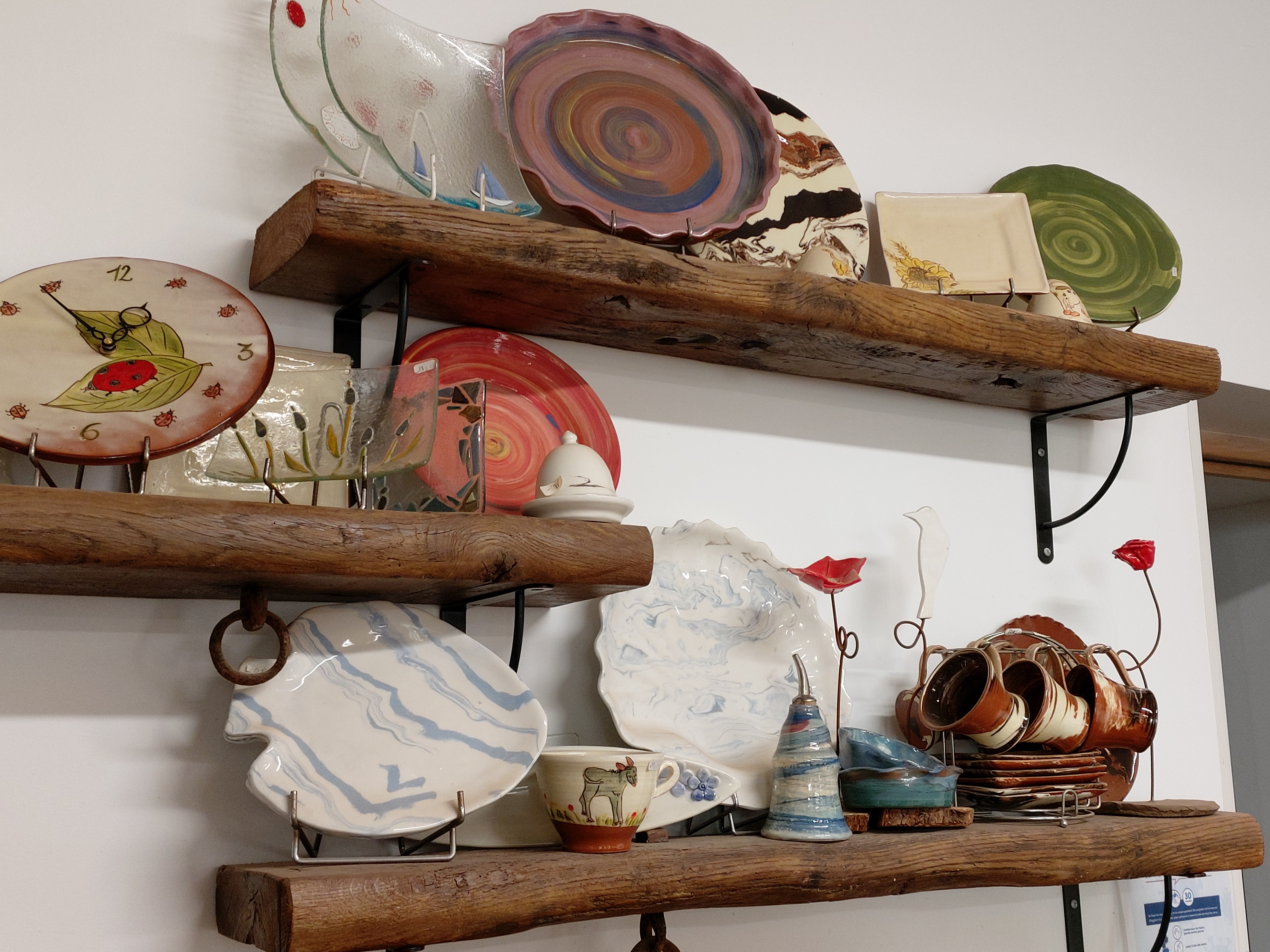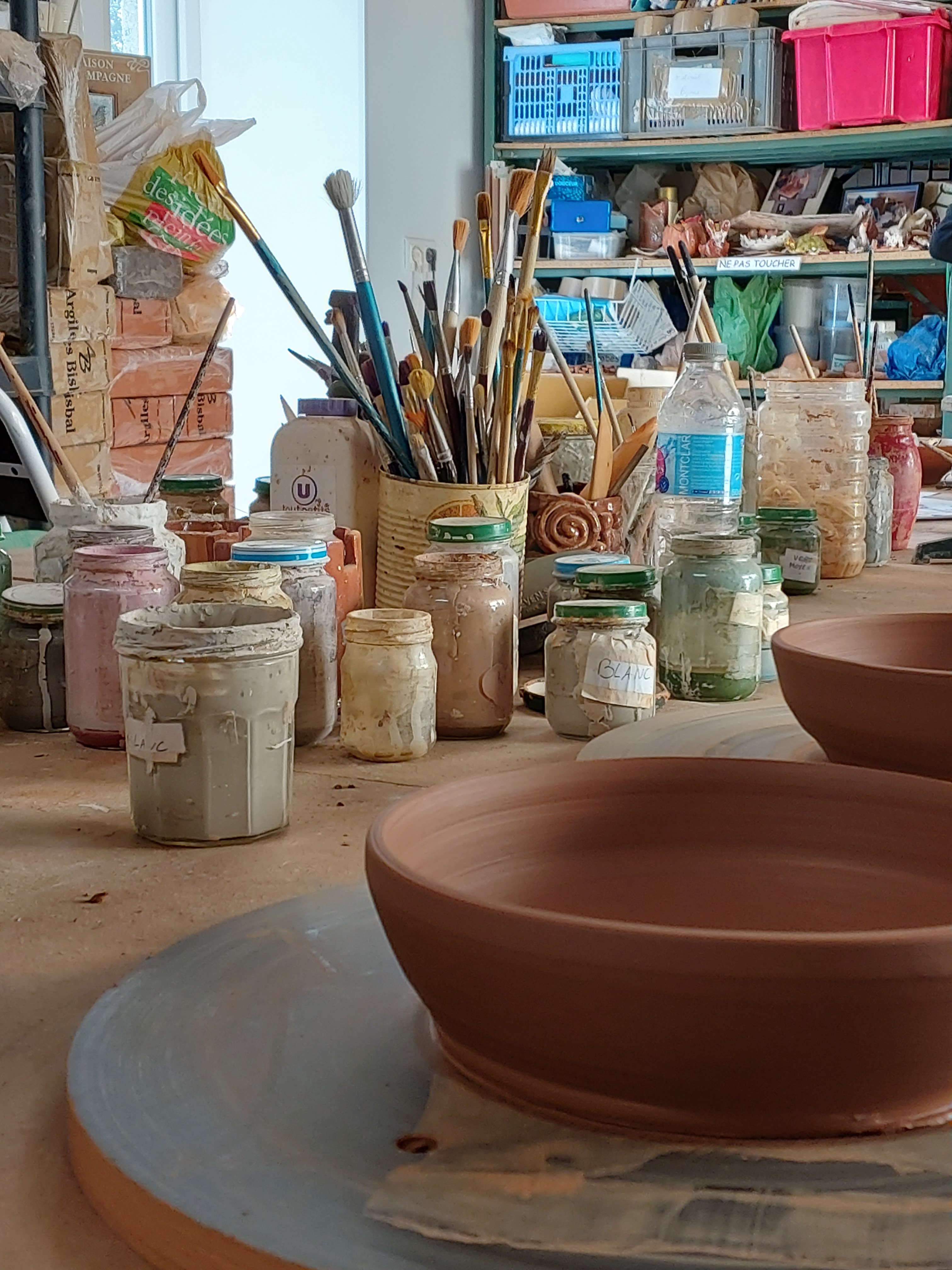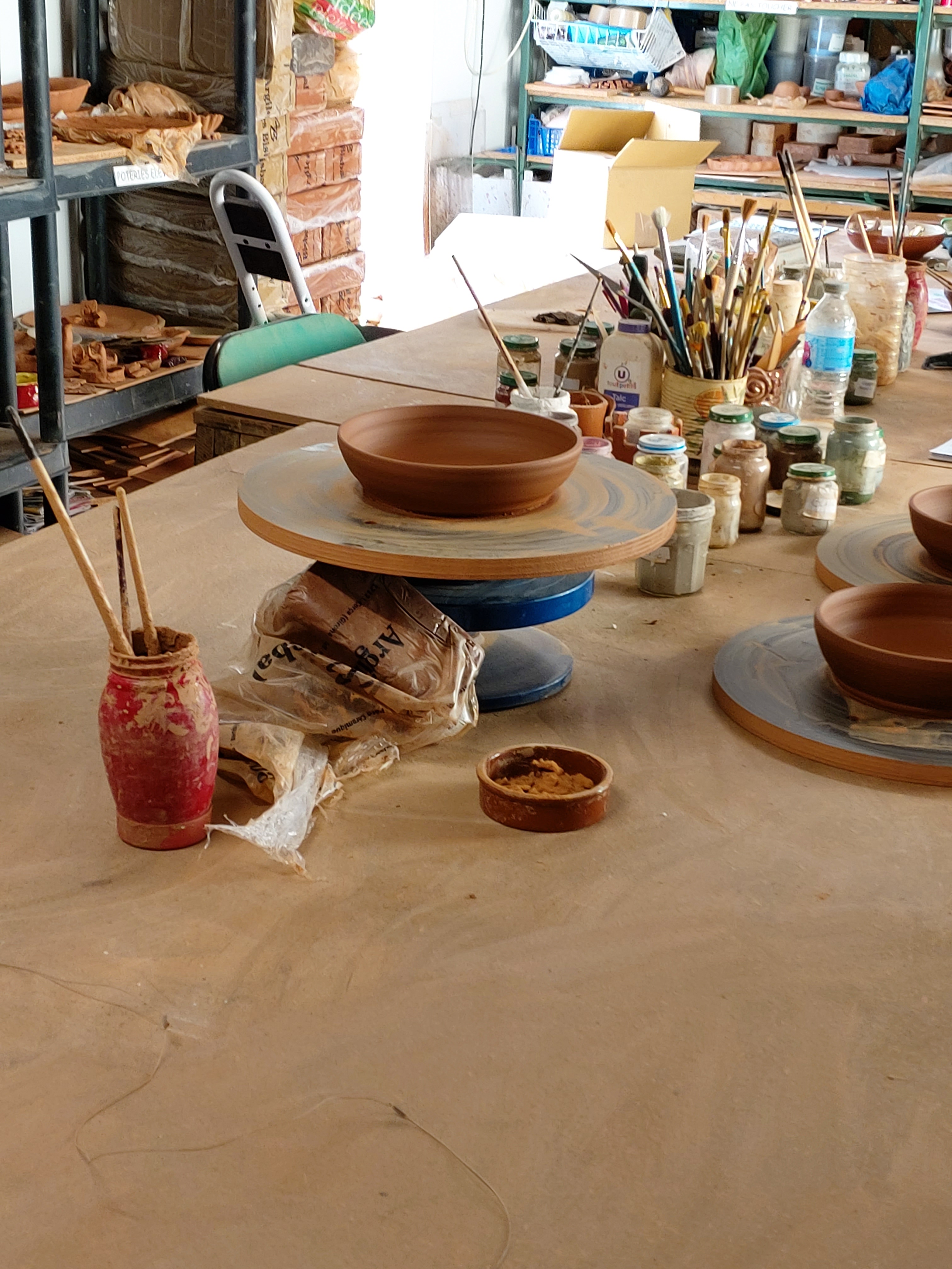 Partir d’une boule de terre et aboutir à un objet du quotidien, quel défi stimulant !!!! En arrivant dans l’atelier, on ne peut qu’être plongé dans l’univers de la poterie avec cet immense plan de travail, ces pots de mélanges de pigments servant à la décoration, cette terre rouge… Nous n’avons qu’une envie, en savoir plus sur les étapes de fabrication des magnifiques poteries de l’Atelier.