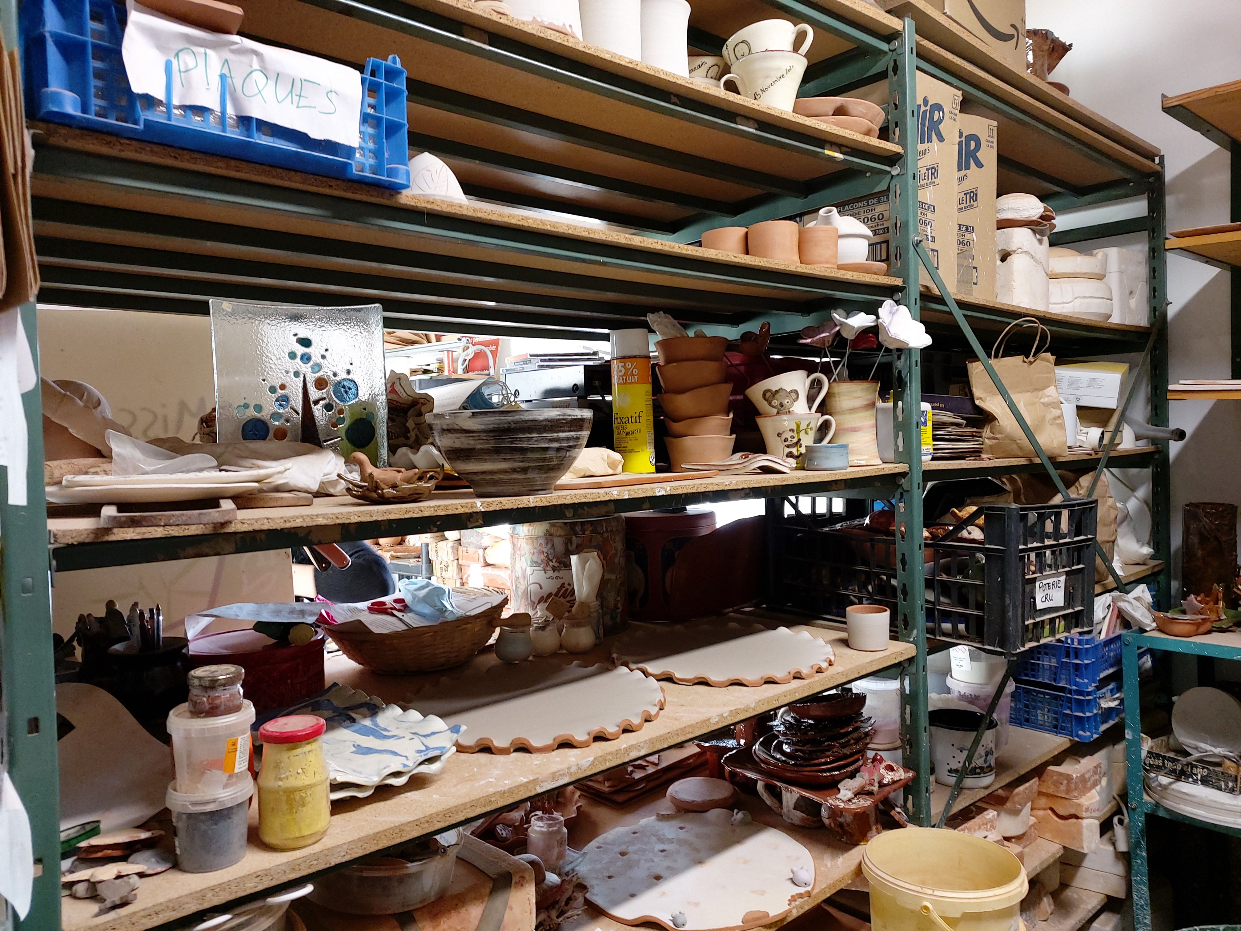 Ensuite, la période de séchage avant de plonger les objets dans un bain d’Engobe (quelle belle référence non !?). Le procédé de l’engobe (revêtement mince à base d’argile délayée) donne des résultats plus variés. Il consiste à recouvrir la pièce d’une couche très mince de terre d’une autre couleur; en grattant cette légère épaisseur d’argile selon un dessin voulu, on retrouve la couleur du fond, créant ainsi un décor.