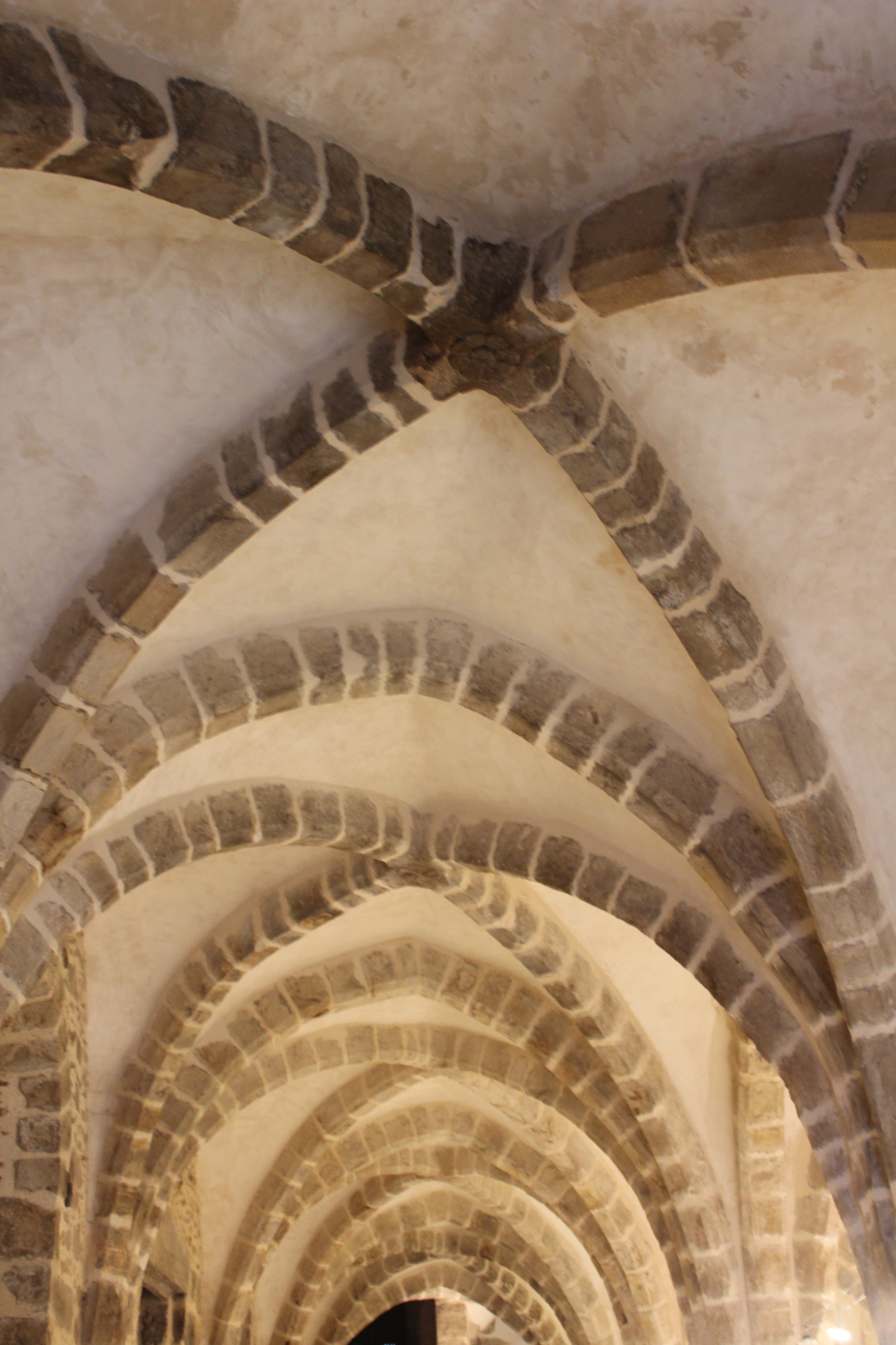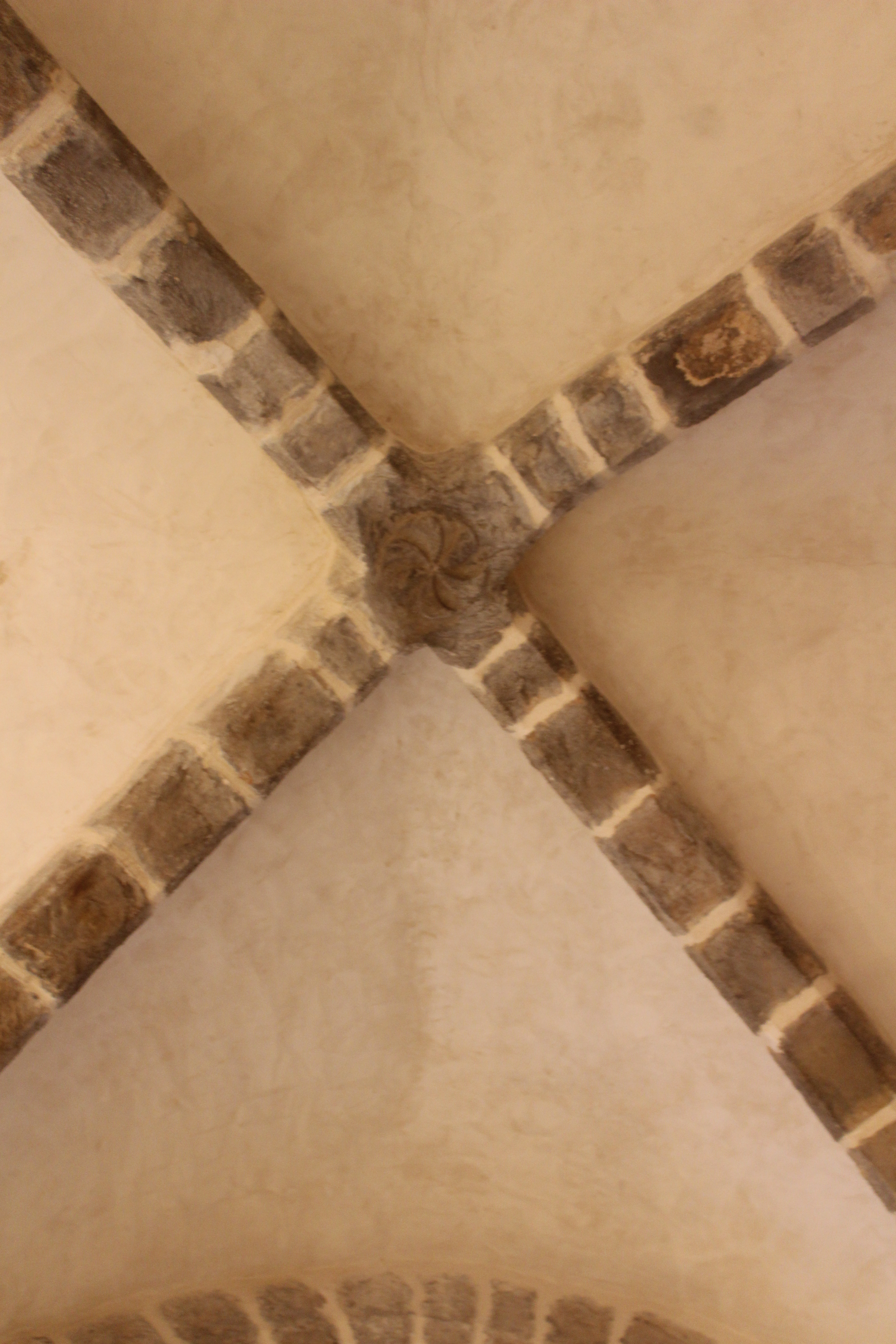 Les nervures partent du sommet en croisée d’ogives (les ogives désignent des arcs en nervures diagonales qui se croisent) qui soutiennent la voûte. Le matériau qui a été utilisé pour construire le bâtiment est bien évidemment le grès typique de la région.