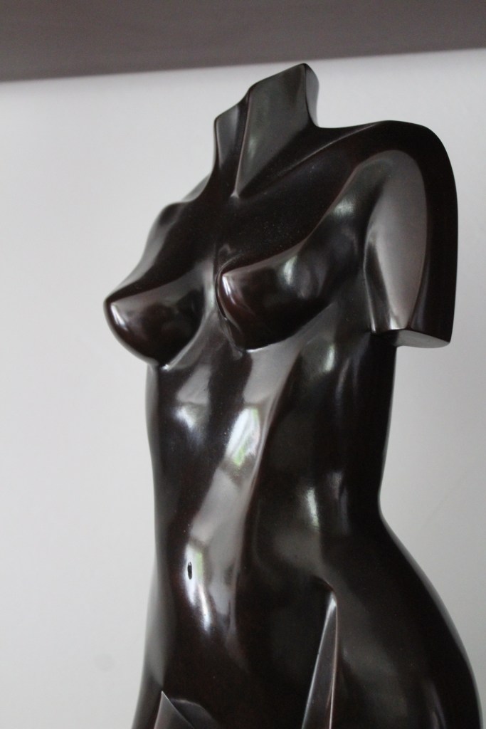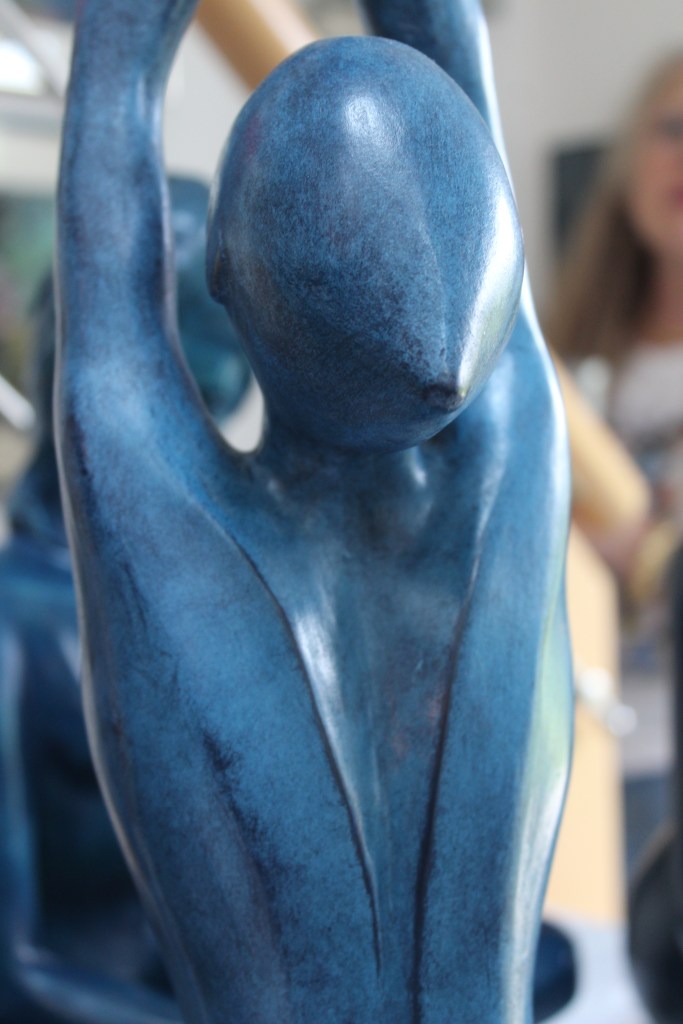 Ça me frappe dès que je pénètre dans son atelier, cette impression d’être dans une caverne d’Ali-Baba, de rentrer dans l’intime d’une créatrice d’art qui se plait à transmettre des émotions aux visiteurs. Des peintures m’entourent et des sculptures m’hypnotisent alors qu’elles ne possèdent pas de visages, car là est toute l’identité de Nad. Ce style néo-cubiste qui font de ses bronzes lissés une seule et même courbe naturelle marquée par des profils anguleux sur le visage, le dos ou bien les jambes qui subliment la femme, éternellement promise et à jamais inaccessible.