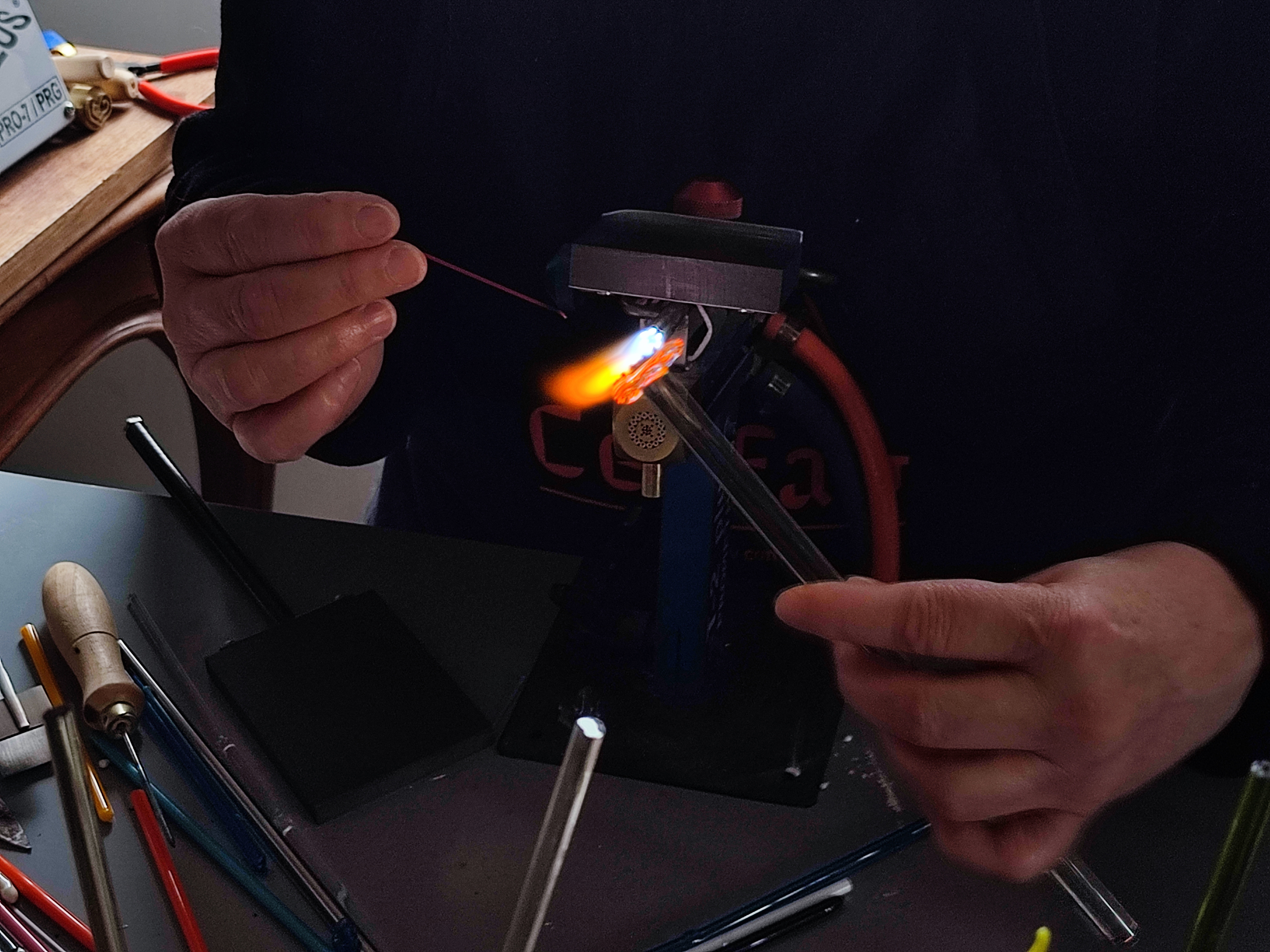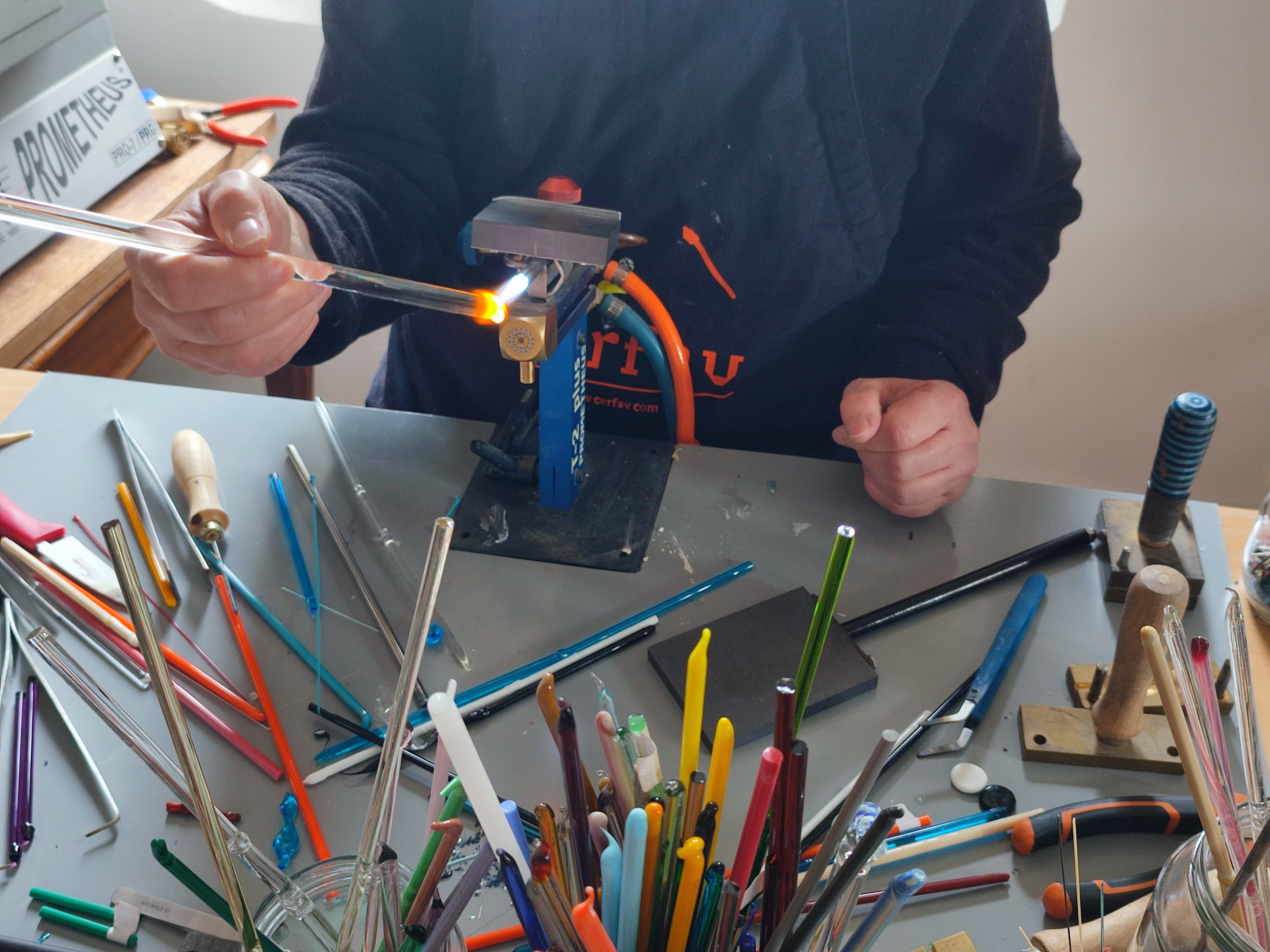 C’est un jeu d’équilibriste qui s’opère entre le verre, le chalumeau et la gravité, le tout orchestré par Isabelle. Ce travail de patience, très précis et minutieux, où il ne faut ni aller trop vite ni trop lentement, dans lequel on joue avec un matériau qui fond à 1300°C, Isabelle a appris à le maîtriser. Toujours très attirée par les métiers manuels, elle se forme au CERFAV (Centre européen de Recherches et Formation aux Arts Verriers) de Nancy et c’est d’abord vers le verre Tiffany qu’elle s’oriente, “mais j’aimais plus le travail de l’étain, de la soudure que le verre Tiffany”.