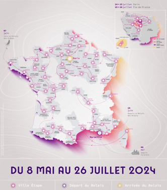 Le 27 avril, la flamme olympique partira à bord du navire Belem depuis la Grèce pour arriver le 8 mai à Marseille, en France. Du 8 mai au 7 juin, la flamme traversera le pays, remontant du Sud-Ouest jusqu’au Nord-Ouest. Ensuite, elle prendra le large pour le relais des océans, qui se déroulera du 8 juin au 17 juin. Le 18 juin, la flamme arrivera à Nice et commencera son voyage vers le Nord-Est. Finalement, elle reviendra sur Paris, en passant par l’Eure-et-Loir, le 7 juillet