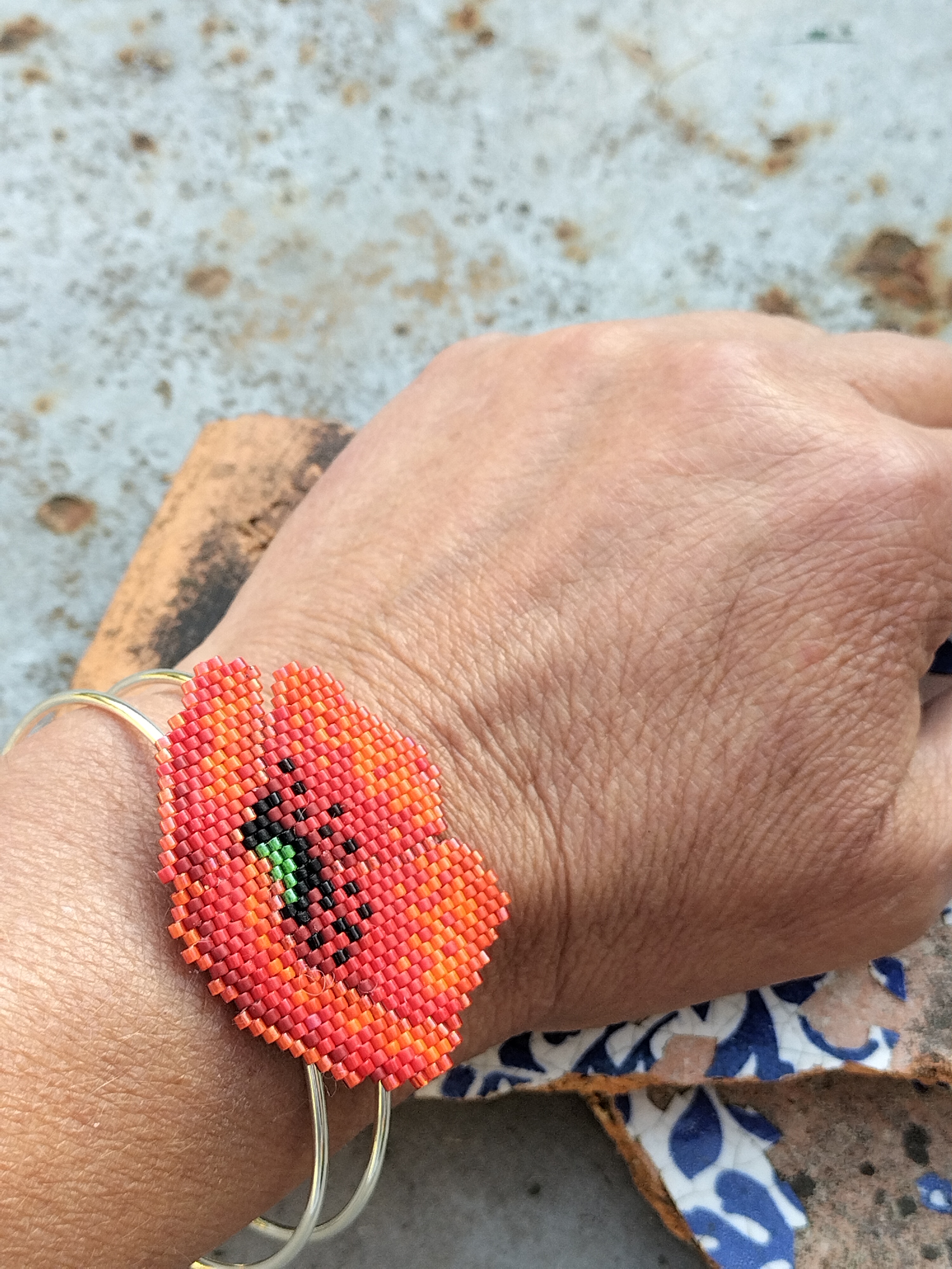 C’est au cours d’une journée découverte qu’elle apprend le tissage de perles sur métier à tisser, séduite par la liberté de création qu’offre cette technique, elle décide de se consacrer pleinement à cet artisanat.